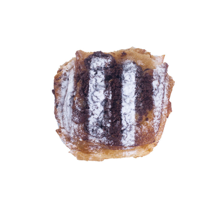 Pain au Chocolat dengan irisan pisang, diberi karamel asin di atasnya dan dilapisi remahan coklat almond.