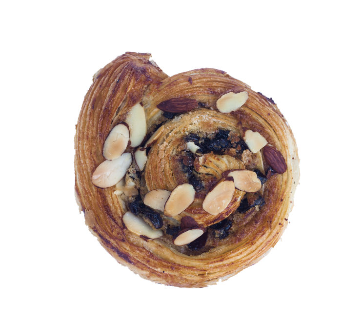Adonan viennoiserie yang berlapis dan flaky digulung menyerupai cangkang siput, dipanggang hingga berwarna cokelat keemasan yang merata. Bagian dalam gulungan diisi dengan krim custard atau pastry cream yang manis, serta taburan kismis (raisins) yang berlimpah. Permukaannya diperkaya dengan irisan kacang almond yang memberikan crunch ekstra, dan lapisan glaze mengkilap yang menjaga kelembaban dan menambah rasa manis.
